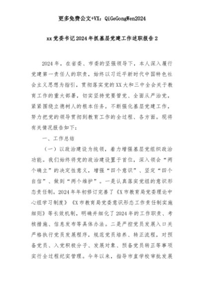 【七哥公文】2025年:xx党委书记2024年抓基层党建工作述职报告2+更多免费公文+VX:QiGeGongWen2024+更多免费公文+VX:QiGeGongWen2024