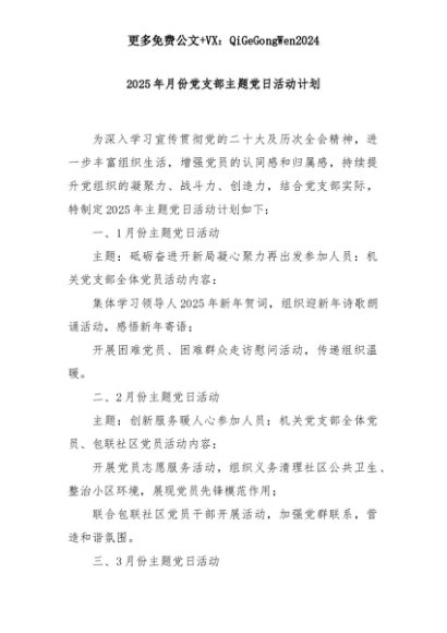 【七哥公文】2025年:2025年月份党支部主题党日活动计划+更多免费公文+VX:QiGeGongWen2024+更多免费公文+VX:QiGeGongWen2024