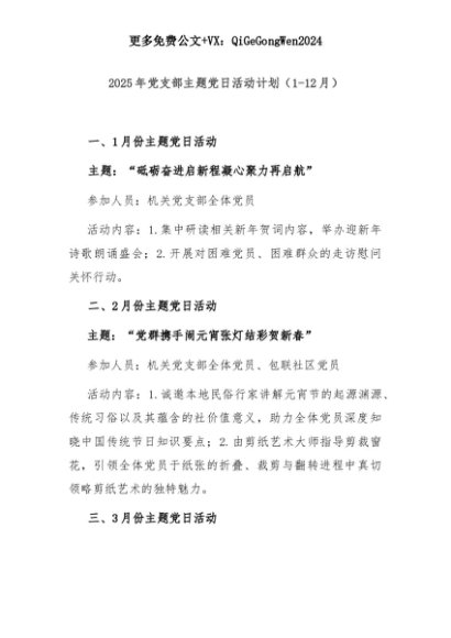 【七哥公文】2025年:2025年党支部主题党日活动计划(1-12月)+更多免费公文+VX:QiGeGongWen2024+更多免费公文+VX:QiGeGongWen2024