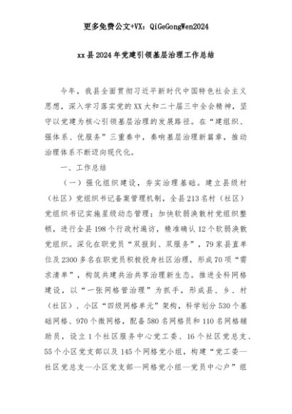 【七哥公文】2025年:xx县2024年党建引领基层治理工作总结+更多免费公文+VX:QiGeGongWen2024+更多免费公文+VX:QiGeGongWen2024