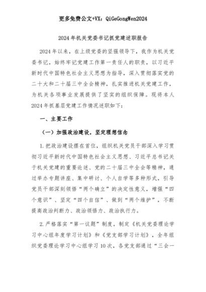 【七哥公文】2025年:2024年机关党委书记抓党建述职报告+更多免费公文+VX:QiGeGongWen2024+更多免费公文+VX:QiGeGongWen2024