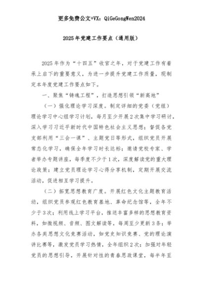 【七哥公文】2025年:2025年党建工作要点(通用版)+更多免费公文+VX:QiGeGongWen2024+更多免费公文+VX:QiGeGongWen2024