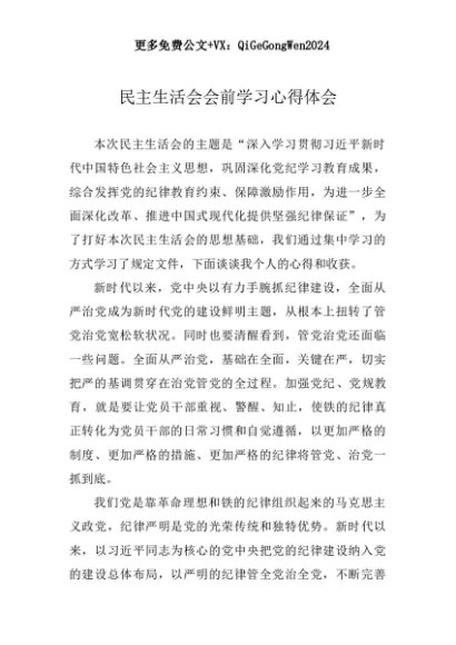 【七哥公文】2025年:08-25年1月中心组交流研讨材料:民主生活会会前学习心得体会+更多免费公文+VX:QiGeGongWen2024+更多免费公文+VX:QiGeGongWen2024
