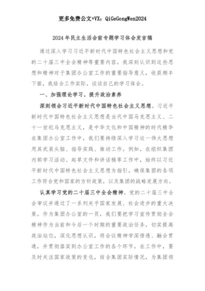 【七哥公文】2025年:2024年民主生活会前专题学习体会发言稿+更多免费公文+VX:QiGeGongWen2024+更多免费公文+VX:QiGeGongWen2024
