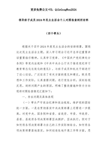 【七哥公文】2025年:领导班子成员2024年民主生活会个人对照检查剖析材料(四个带头)+更多免费公文+VX:QiGeGongWen2024+更多免费公文+VX:QiGeGongWen2024