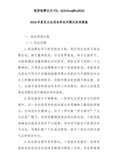 【七哥公文】2025年:2024年度民主生活会存在问题及改进措施+更多免费公文+VX:QiGeGongWen2024+更多免费公文+VX:QiGeGongWen2024