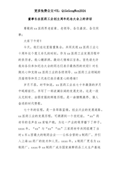 【七哥公文】2025年:董事长在医药工业创立周年纪念大会上的讲话+更多免费公文+VX:QiGeGongWen2024+更多免费公文+VX:QiGeGongWen2024