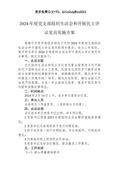 【七哥公文】2025年:2024年度党支部组织生活会和开展民主评议党员实施方案+更多免费公文+VX:QiGeGongWen2024+更多免费公文+VX:QiGeGongWen2024