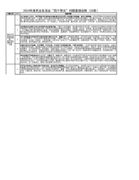 【七哥公文】2025年:2024年度民主生活会“四个带头”问题查摆台账(20条)+更多免费公文+VX:QiGeGongWen2024+更多免费公文+VX:QiGeGongWen2024