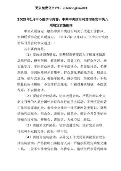 【七哥公文】2025年:03-25年1月中心组学习内容:中共中央政治局贯彻落实中央八项规定实施细则+更多免费公文+VX:QiGeGongWen2024+更多免费公文+VX:QiGeGongWen2024