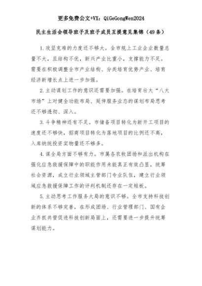 【七哥公文】2025年:(49条)民主生活会领导班子及班子成员互提意见集锦+更多免费公文+VX:QiGeGongWen2024+更多免费公文+VX:QiGeGongWen2024