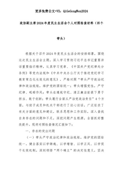 【七哥公文】2025年:政协副主席2024年度民主生活会个人对照检查材料(四个带头)+更多免费公文+VX:QiGeGongWen2024+更多免费公文+VX:QiGeGongWen2024