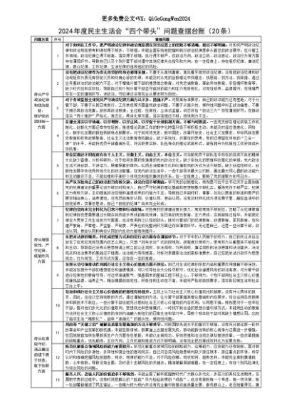 【七哥公文】2025年:(20条)2024年度民主生活会“四个带头”问题查摆台账+更多免费公文+VX:QiGeGongWen2024+更多免费公文+VX:QiGeGongWen2024