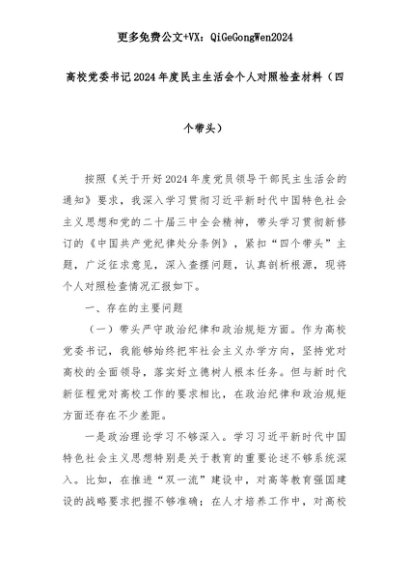 【七哥公文】2025年:高校党委书记2024年度民主生活会个人对照检查材料(四个带头)+更多免费公文+VX:QiGeGongWen2024+更多免费公文+VX:QiGeGongWen2024