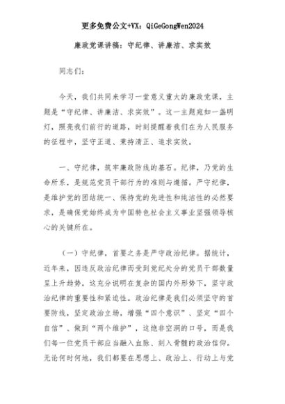 【七哥公文】2025年:廉政党课讲稿:守纪律、讲廉洁、求实效+更多免费公文+VX:QiGeGongWen2024+更多免费公文+VX:QiGeGongWen2024
