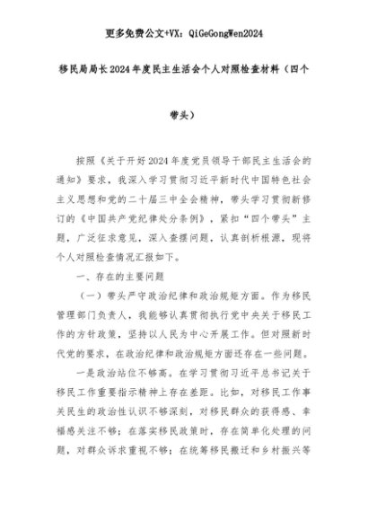 【七哥公文】2025年:移民局局长2024年度民主生活会个人对照检查材料(四个带头)+更多免费公文+VX:QiGeGongWen2024+更多免费公文+VX:QiGeGongWen2024