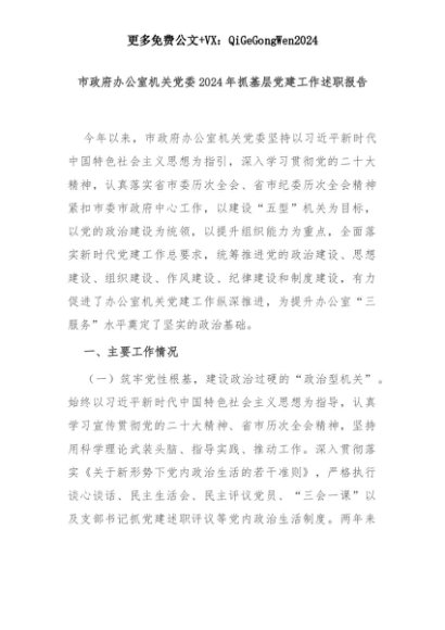 【七哥公文】2025年:市政府办公室机关党委2024年抓基层党建工作述职报告+更多免费公文+VX:QiGeGongWen2024+更多免费公文+VX:QiGeGongWen2024