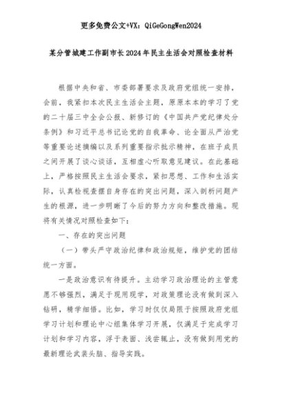 【七哥公文】2025年:某分管城建工作副市长2024年民主生活会对照检查材料+更多免费公文+VX:QiGeGongWen2024+更多免费公文+VX:QiGeGongWen2024