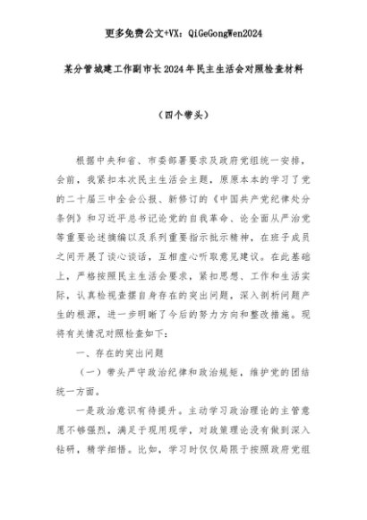 【七哥公文】2025年:某分管城建工作副市长2024年民主生活会对照检查材料(四个带头)+更多免费公文+VX:QiGeGongWen2024+更多免费公文+VX:QiGeGongWen2024