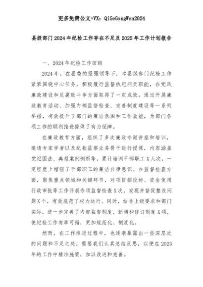 【七哥公文】2025年:县级部门2024年纪检工作存在不足及2025年工作计划报告+更多免费公文+VX:QiGeGongWen2024+更多免费公文+VX:QiGeGongWen2024