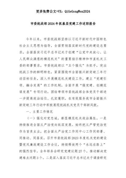 【七哥公文】2025年:市委统战部2024年抓基层党建工作述职报告+更多免费公文+VX:QiGeGongWen2024+更多免费公文+VX:QiGeGongWen2024