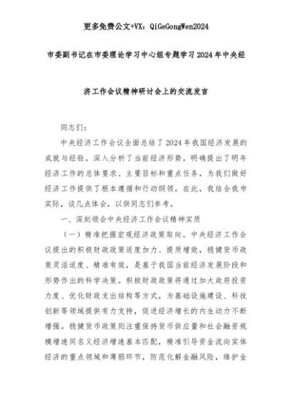 【七哥公文】2025年:市委副书记在市委理论学习中心组专题学习2024年中央经济工作会议精神研讨会上的交流发言+更多免费公文+VX:QiGeGongWen2024+更多免费公文+VX:QiGeGongWen2024