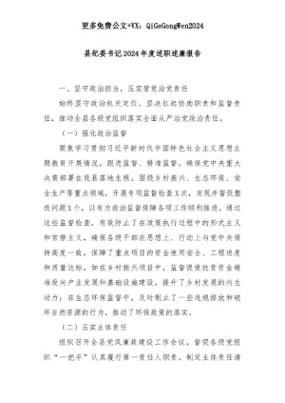 【七哥公文】2025年:县纪委书记2024年度述职述廉报告+更多免费公文+VX:QiGeGongWen2024+更多免费公文+VX:QiGeGongWen2024