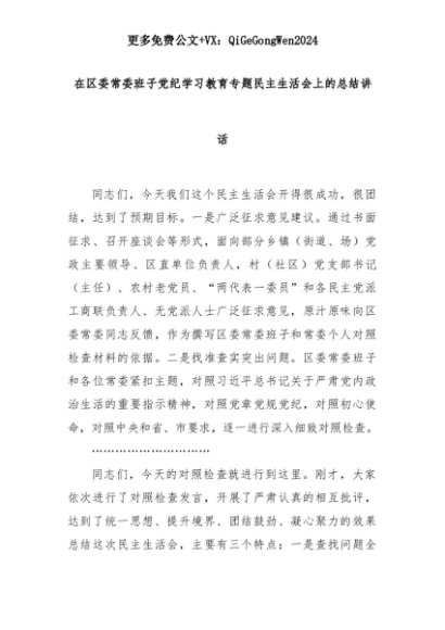 【七哥公文】2025年:在区委常委班子党纪学习教育专题民主生活会上的总结讲话+更多免费公文+VX:QiGeGongWen2024+更多免费公文+VX:QiGeGongWen2024