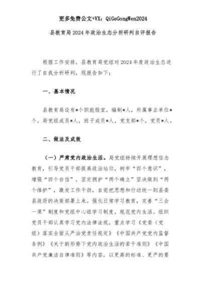 【七哥公文】2025年:县教育局2024年政治生态分析研判自评报告+更多免费公文+VX:QiGeGongWen2024+更多免费公文+VX:QiGeGongWen2024