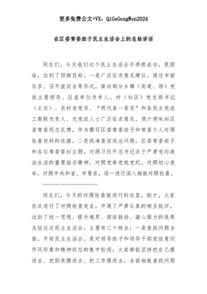 【七哥公文】2025年:在区委常委班子民主生活会上的总结讲话+更多免费公文+VX:QiGeGongWen2024+更多免费公文+VX:QiGeGongWen2024
