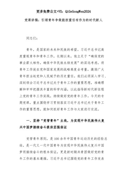 【七哥公文】2025年:党课讲稿:引领青年争做能担重任有作为的时代新人+更多免费公文+VX:QiGeGongWen2024+更多免费公文+VX:QiGeGongWen2024