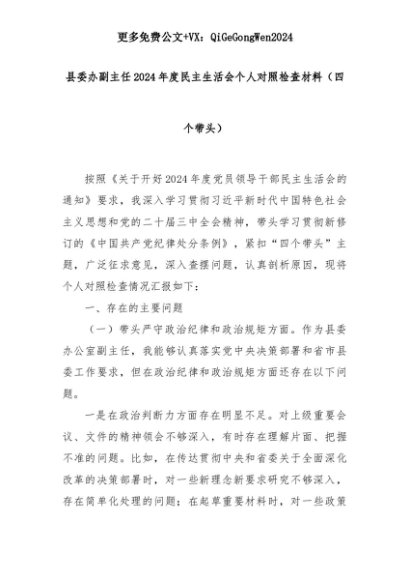 【七哥公文】2025年:县委办副主任2024年度民主生活会个人对照检查材料(四个带头)+更多免费公文+VX:QiGeGongWen2024+更多免费公文+VX:QiGeGongWen2024