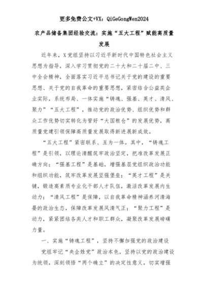 【七哥公文】2025年:农产品储备集团经验交流:实施“五大工程”赋能高质量发展+更多免费公文+VX:QiGeGongWen2024+更多免费公文+VX:QiGeGongWen2024
