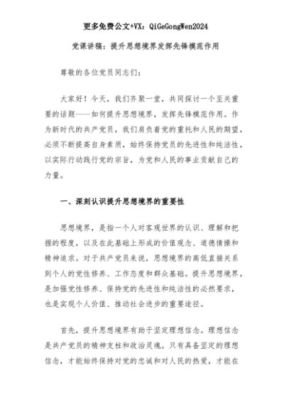 【七哥公文】2025年:党课讲稿:提升思想境界发挥先锋模范作用+更多免费公文+VX:QiGeGongWen2024+更多免费公文+VX:QiGeGongWen2024