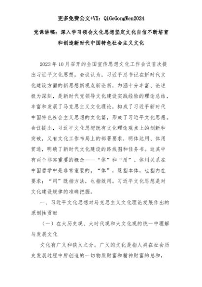 【七哥公文】2025年:党课讲稿:深入学习领会文化思想坚定文化自信不断培育和创造新时代中国特色社会主义文化+更多免费公文+VX:QiGeGongWen2024+更多免费公文+VX:QiGeGongWen2024