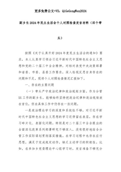 【七哥公文】2025年:副乡长2024年民主生活会个人对照检查发言材料(四个带头)+更多免费公文+VX:QiGeGongWen2024+更多免费公文+VX:QiGeGongWen2024