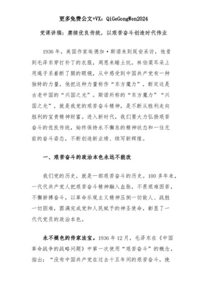 【七哥公文】2025年:党课讲稿:赓续优良传统,以艰苦奋斗创造时代伟业+更多免费公文+VX:QiGeGongWen2024+更多免费公文+VX:QiGeGongWen2024