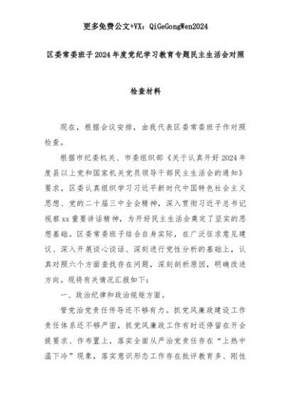 【七哥公文】2025年:区委常委班子2024年度党纪学习教育专题民主生活会对照检查材料+更多免费公文+VX:QiGeGongWen2024+更多免费公文+VX:QiGeGongWen2024