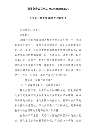【七哥公文】2025年:公司办公室主任2024年述职报告+更多免费公文+VX:QiGeGongWen2024+更多免费公文+VX:QiGeGongWen2024