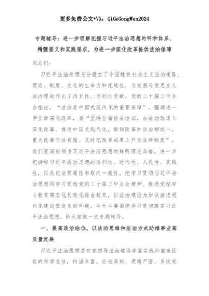 【七哥公文】2025年:专题辅导:进一步理解把握习近平法治思想的科学体系、精髓要义和实践要求,为进一步深化改革提供法治保障+更多免费公文+VX:QiGeGongWen2024+更多免费公文+VX:QiGeGongWen2024