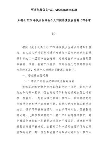 【七哥公文】2025年:乡镇长2024年民主生活会个人对照检查发言材料(四个带头)+更多免费公文+VX:QiGeGongWen2024+更多免费公文+VX:QiGeGongWen2024