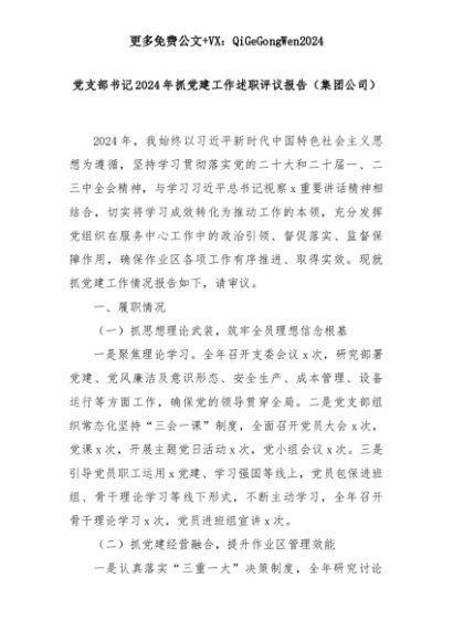 【七哥公文】2025年:党支部书记2024年抓党建工作述职评议报告(集团公司)+更多免费公文+VX:QiGeGongWen2024+更多免费公文+VX:QiGeGongWen2024