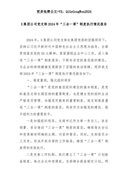 【七哥公文】2025年:X集团公司党支部2024年“三会一课”制度执行情况报告+更多免费公文+VX:QiGeGongWen2024+更多免费公文+VX:QiGeGongWen2024