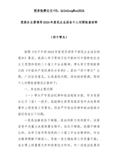 【七哥公文】2025年:党委办主要领导2024年度民主生活会个人对照检查材料(四个带头)+更多免费公文+VX:QiGeGongWen2024+更多免费公文+VX:QiGeGongWen2024