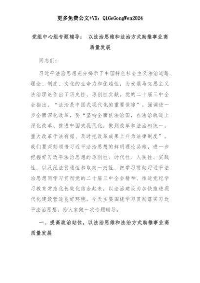 【七哥公文】2025年:党组中心组专题辅导: 以法治思维和法治方式助推事业高质量发展+更多免费公文+VX:QiGeGongWen2024+更多免费公文+VX:QiGeGongWen2024