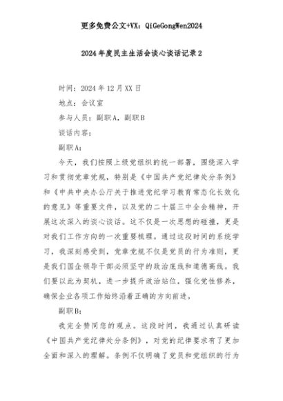 【七哥公文】2025年:2024年度民主生活会谈心谈话记录2+更多免费公文+VX:QiGeGongWen2024+更多免费公文+VX:QiGeGongWen2024