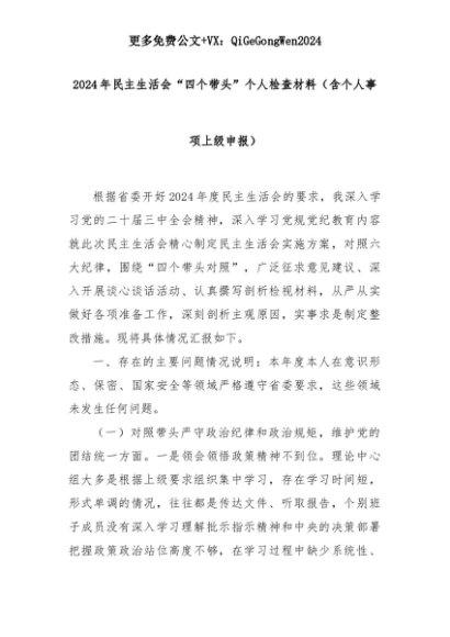 【七哥公文】2025年:2024年民主生活会“四个带头”个人检查材料(含个人事项上级申报)+更多免费公文+VX:QiGeGongWen2024+更多免费公文+VX:QiGeGongWen2024
