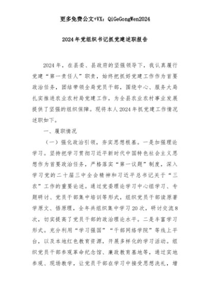 【七哥公文】2025年:2024年党组织书记抓党建述职报告+更多免费公文+VX:QiGeGongWen2024+更多免费公文+VX:QiGeGongWen2024
