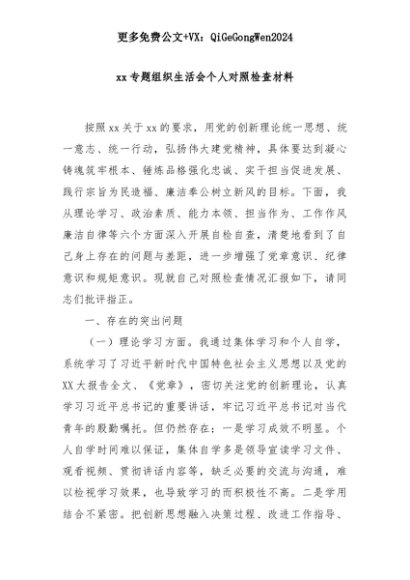 【七哥公文】2025年:xx专题组织生活会个人对照检查材料+更多免费公文+VX:QiGeGongWen2024+更多免费公文+VX:QiGeGongWen2024