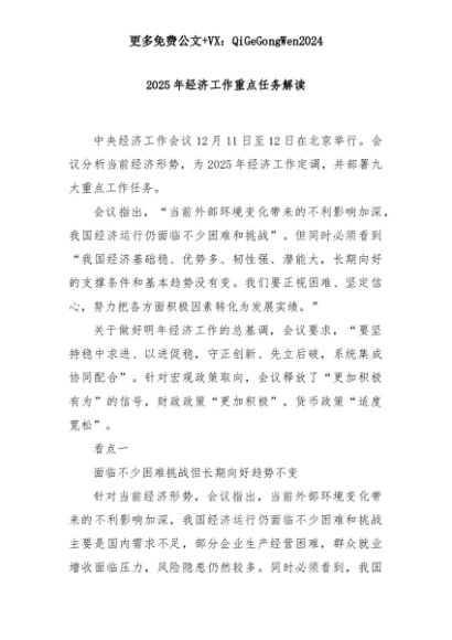 【七哥公文】2025年:2025年经济工作重点任务解读+更多免费公文+VX:QiGeGongWen2024+更多免费公文+VX:QiGeGongWen2024